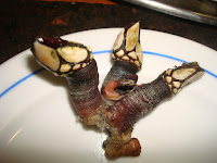 Wenn sie auf den Tisch kommen, sehen sie so aus. Jetzt trennt man die dicke, raue Haut vom "Schnabel" (ja sieht doch so aus, oder wie soll man dem sonst sagen?) und der Stiel, der darunter hervor kommt, ist essbar. Saftig, ganz leicht gummig aber nicht zäh, zart aber konsistenter als eine Muschel, geschmacklich schwer einzuordnen, doch das ganz leicht Süßliche von Krustentieren ist unverkennbar.